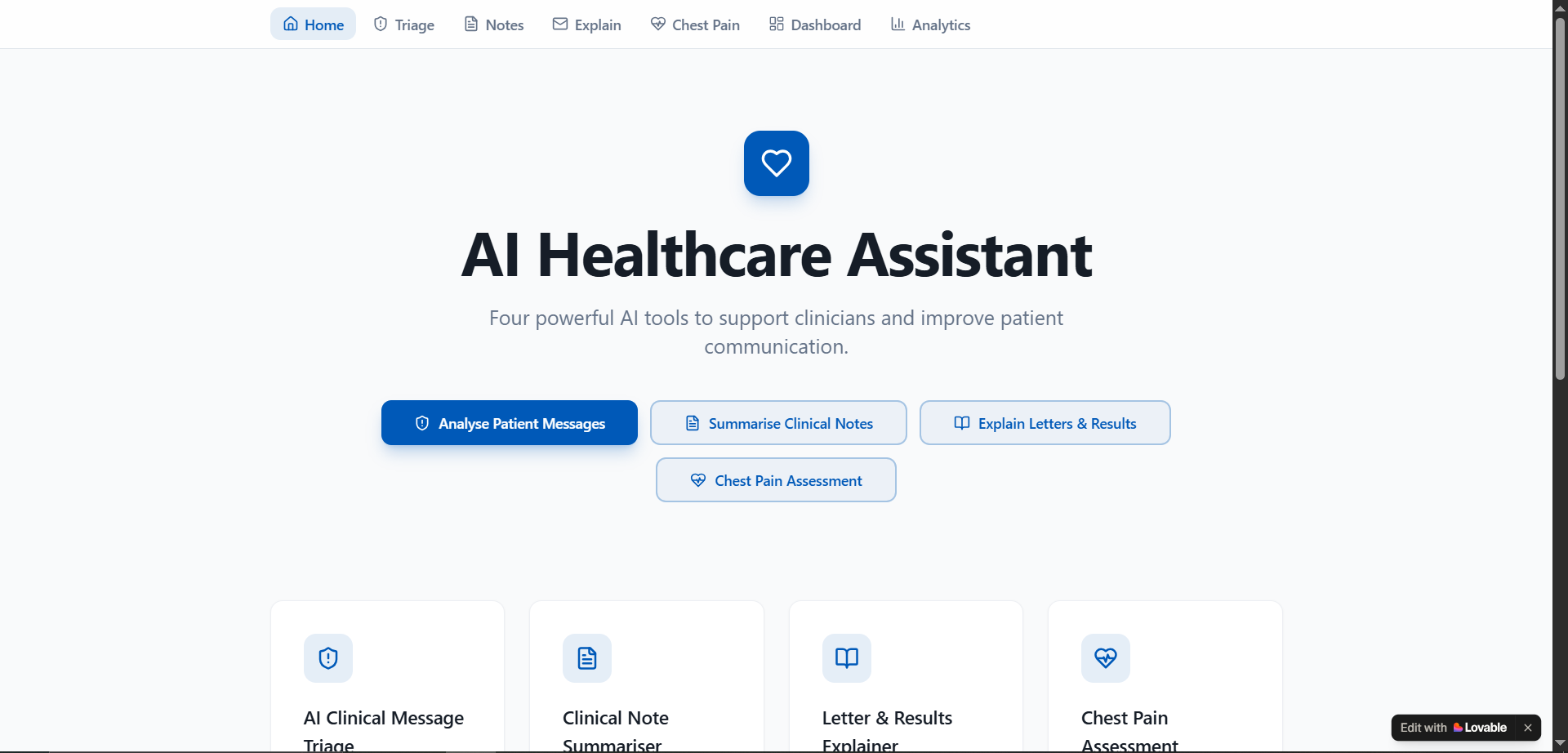 - An AI‑assisted clinical communication hub that improves patient-clinician interactions through safe triage, clear plain‑English explanations, clinical note summarisation, and a transparent rule‑based chest‑pain risk scoring system.