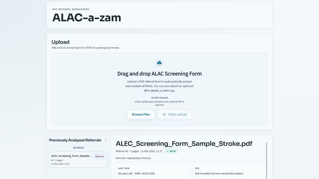- Wheelchair referrals are slow and inconsistent. ALAC-a-zam parses NHS PDF forms, applies expert clinical rules via Bayesian inference, and recommends chair specification and urgency summarised by LLM with full transparency in an accessible web app.